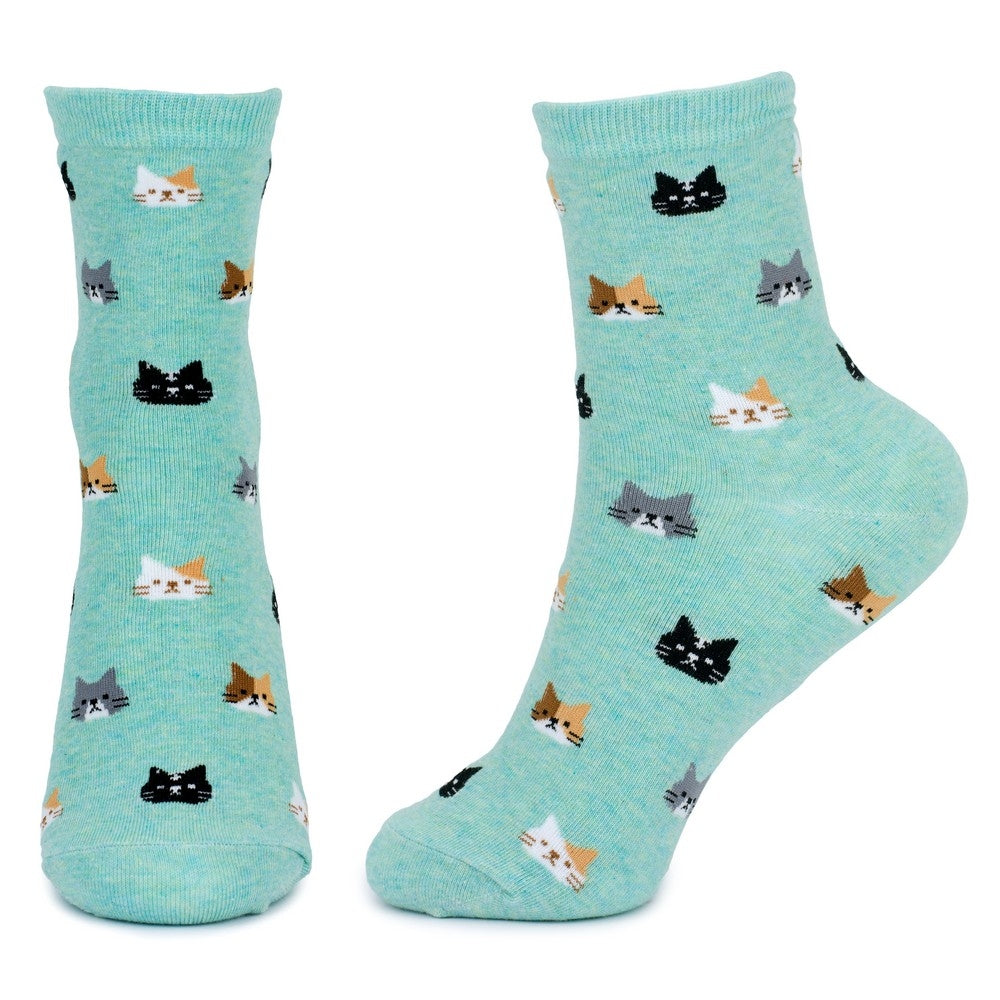 Step into a world of whimsy with these Ladies Dream Cat Green Socks. Featuring a charming cat head design on a mint green sock, they add a playful pop of personality to your outfit while keeping your feet cozy and comfy all day long. Perfect for cat lovers who want to sprinkle a little fun into their wardrobe.