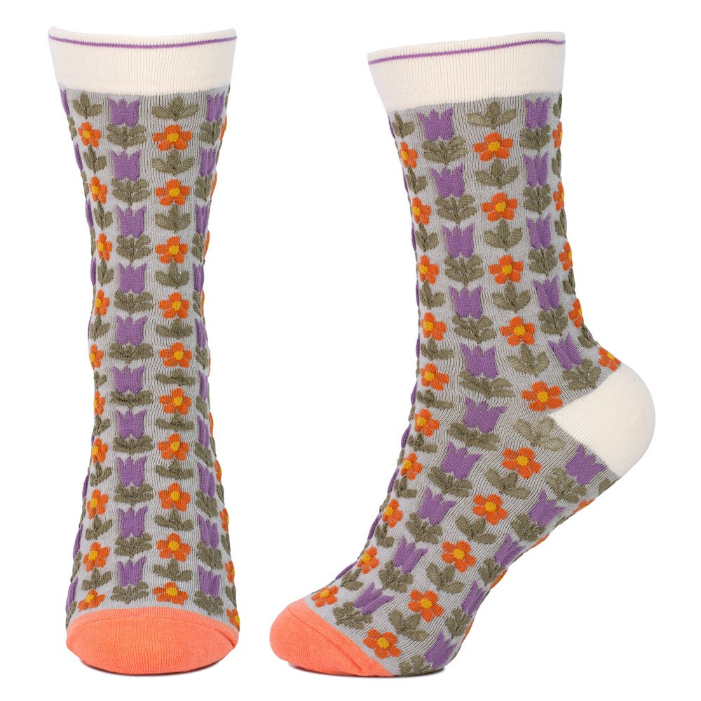 Ladies Embossed Retro Flower Purple & Orange Socks