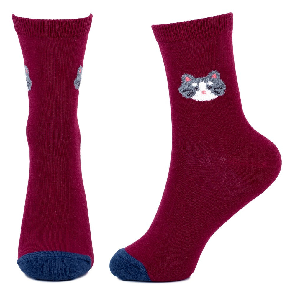Paws-itively adorable, these burgundy cat socks are the purr-fect addition to any outfit. Featuring a cute cat face design, these ladies' socks are both cozy and playful. Step out in style and show off your love for felines with these quirky socks. Meow-tastic!
