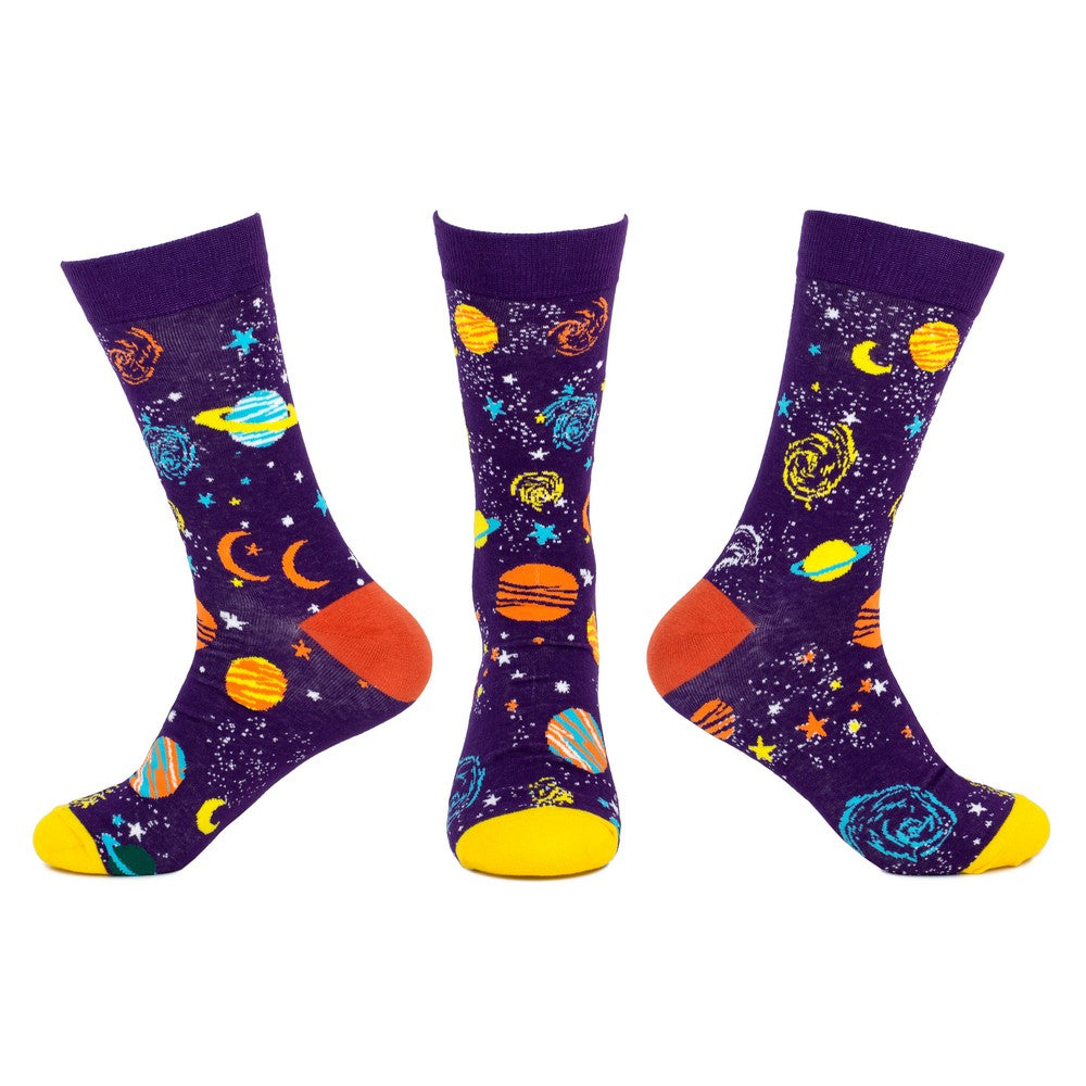 Step into style with our men's Solar System Socks! These quirky socks feature a fun solar system pattern, adding a playful touch to any outfit. Made with a vibrant purple colour, these socks are out of this world. Perfect for the guy who likes to stand out!