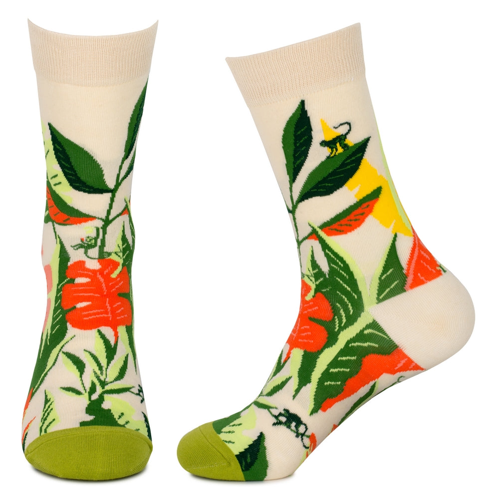 Step into paradise with our Mens Tropical Foliage Socks! These eye-catching socks feature vibrant tropical patterns on a sophisticated cream background. Perfect for adding a playful pop to your outfit, whether you're dressing up for work or lounging on the weekend. Your feet deserve a holiday too!